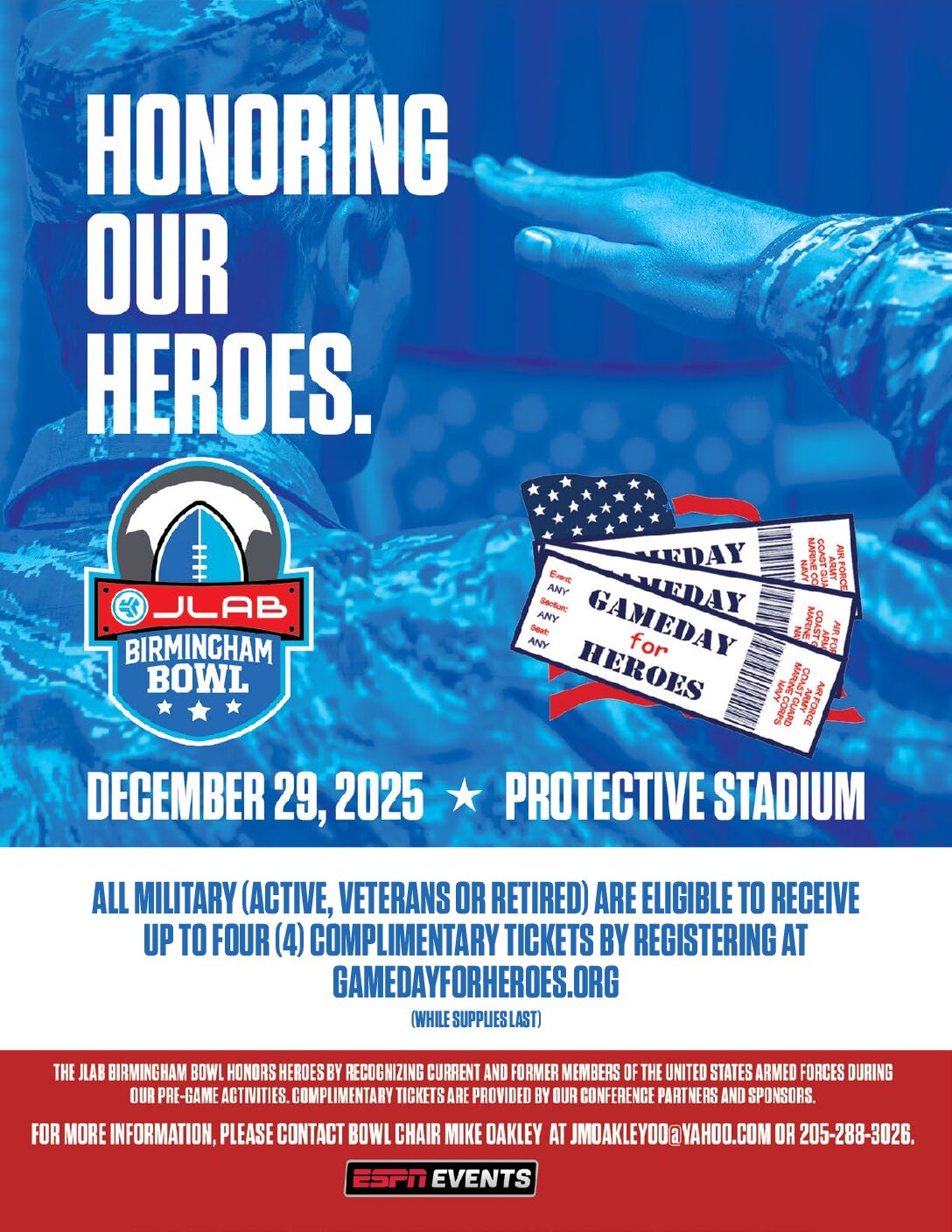 If you are a current or former member of the US Armed Services and need additional information, please contact Bowl Chair Mike Oakley at [email protected] or 205-288-3026 or Todd Bennett at [email protected].
